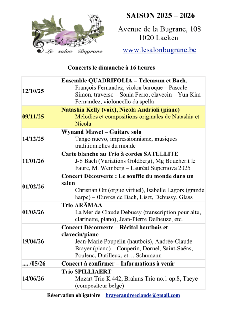 (*) Gratis concert op 17 november om 16:30 uur als onderdeel van de Artistieke Wandeling van Neder-Over-Heembeek op 17/11/2024.