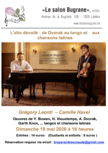 L’excellent pianiste Grégory Leonti ( professeur au Conservatoire Royal de Bruxelles ) et son partenaire, Camille Havel, altiste, (formé aux conservatoires supérieurs de Lyon et de Paris, ainsi qu’au Mozarteum de Salzbourg), nous promettent un superbe moment de grâce et de virtuosité.